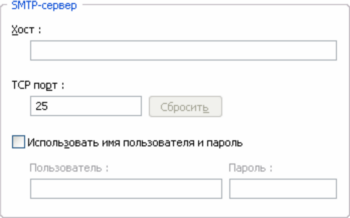 В поле «Хост» введите имя хоста или ip-адрес SMTP-сервера, в поле «TCP-порт», введите номер порта SMTP-сервера, если он отличается от стандартного. Если для доступа к серверу необходима аутентификация, поставьте галочку «Использовать имя пользователя и пароль» и введите в соответствующие поля имя пользователя и пароль. |